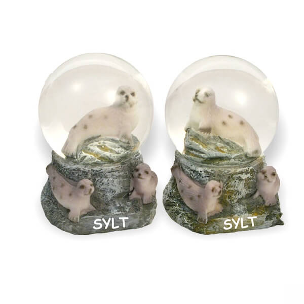 Stimmungsvolle Schneekugel mit grauem Sockel und Sylt-Prägung. Im Inneren: Ein grauer Seehund auf einem Felsen, umgeben von sanft wirbelndem Schnee. Ein stilvolles Souvenir und perfektes Geschenk für alle Sylt-Liebhaber.